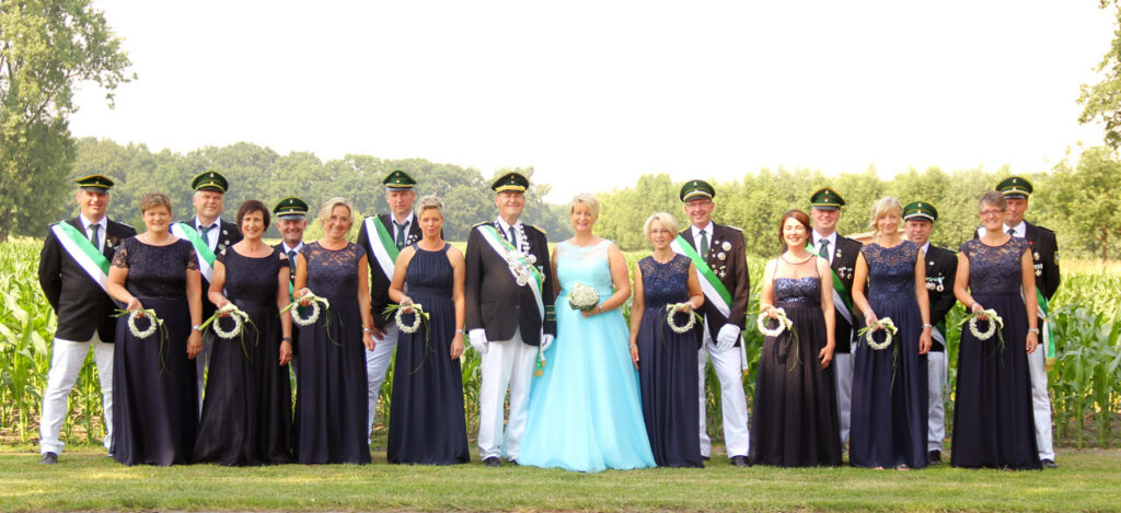 Gruppenfoto Hofstaat 2018 v. l.: Bernhard und Doris Gutland, Christoph und Petra Wilmes, Norbert und Lucia Freesmeier, Elmar und Nicole Gutland, Kaiserpaar Franz-Josef und Hiltrud Risse, Annette und Hubert Jostmeier, Angela und Christoph Löseke, Annette und Roland Klein, Gabi und Georg Reineke